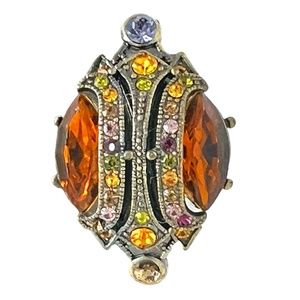 Amber, purple, yellow, red and green crystal fashion ring. Set in burnished goldtone. Adjustable back for sizing. The smallest it can be closed is a size 6. There is one larger purple stone missing and a small reddish one missing as well. Otherwise, in good preowned condition.