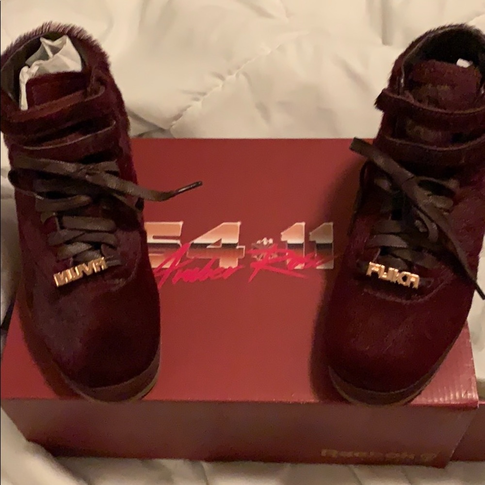 Beautiful Merlot/Rose Gold in color. Never been worn. Merely purchased for display! Includes: Original box and extra pair of shoelaces with rose gold tips still in package.
