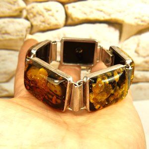AMAZING OLD ESTATE AMBER PANEL LINK BRACELET with STAMPED 925 STERLING SILVER. GREENISH AMBER.