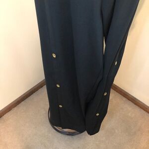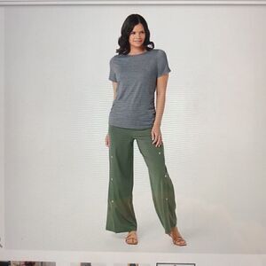 Flattering !! palazzo pants. The bottom two buttons have the option of being left open to give even more flair to your walk. Flows smoothly throughout the legs. Perfect with flats, shootie or sneakers. Wear with a heel for a long lean fashion forward look for 2023 ! Measurements: small 15” to 20” stretched, large 17” to 22” stretched.