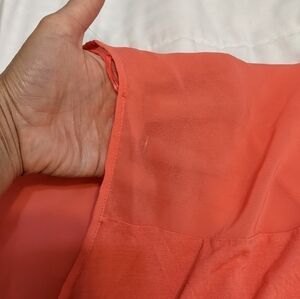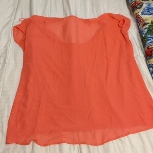 ambiance apparel lightweight almost sheer coral colored top size 3x. the shoulder panels and back are slightly sheer so see the pictures for details because with the right undergarments it may be see through. pit to pit measures 31 in and shoulder to front waist is 24 in and it is slightly longer in the back. the sleeves are almost sleeveless with a teeny tiny cap sleeve for a flattering fit.