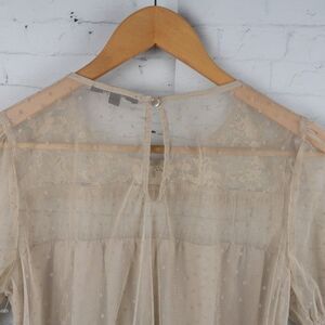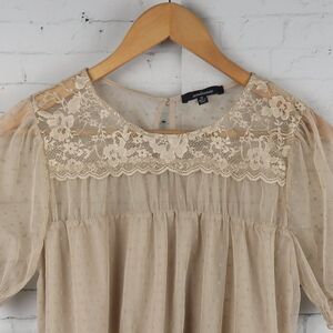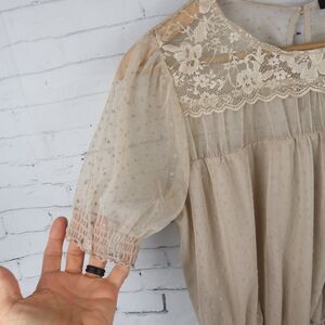 TAN SHORT SLEEVE ROUND NECK SHEER CROP TOP WITH LACE & POLKA DOT DETAIL SIZE MEDIUM BY AMBIANCE PRE OWNED NO FLAWS