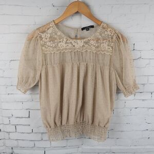 AMBIANCE TAN SHORT SLEEVE ROUND NECK SHEER TOP WITH LACE DETAIL SIZE M