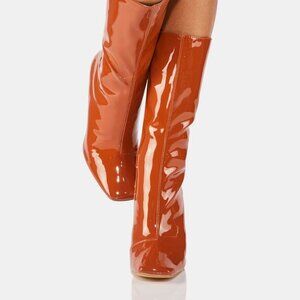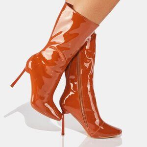 Ambling Mocha Hearts Booties cuz they couldn't look away if they tried. Stand out with these vinyl booties that have a vegan leather construction, pointed toes, stiletto heels, and side zip closures