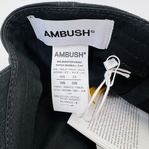 The AMBUSH Patch Baseball Cap Hat is a unisex accessory that comes in black color and one size that fits all. It features an adjustable strap for a comfortable fit. The cap has a classic baseball style and is adorned with a patch that adds a touch of uniqueness to the design.