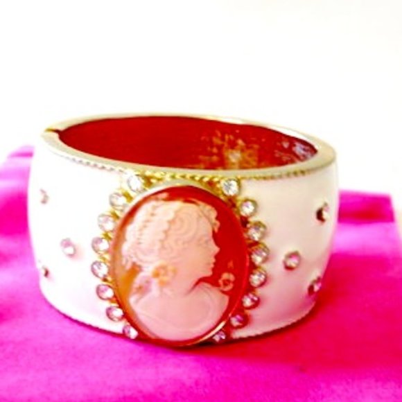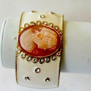 AMEDEO NYC Oval White Hinged Enamel Cuff Bangle Bracelet Size 7-1/2. Design Information: Bracelet features bezel-set Cornelian Cameo depicting a woman's profile framed in round CZs and scattered around the bangles circumference. Measurements: Approx. 3"L x 7.5"W x 1.5"H - Fits Approx. 6-3/4 to 7-1/2" wrist. Metal Type: Brass; Metal Color: Yellow; Finish: Polished Enamel; Findings: Hinged Stone Information: Cornelian Shell Oval (35x27mm) Country of Origin: Cameo Hand-carved in Italy; Assembled in China.
