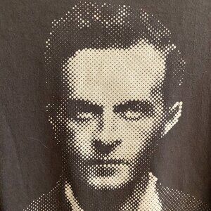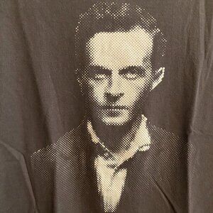 Dark gray short sleeve T-shirt with pointillistic image of the philosopher Ludwig Wittgenstein.