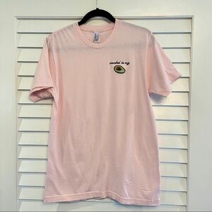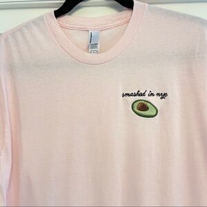 AMERICAN APPAREL 100% SOFT LIGHT PINK COTTON CREW NECK T-SHIRT WITH EMBROIDERED “smashed in NYC” and half an avocado.