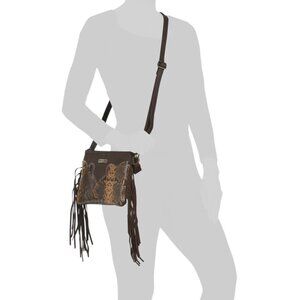 tassel trim, brand logo hardware, pebbled finish, suede front, adjustable detachable crossbody strap, convertible style, snakeskin pattern