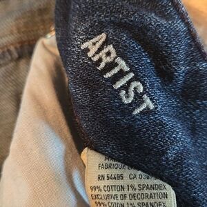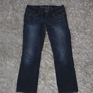 AMERICAN EAGLE ARTIST CROP STRETCH DENIM BLUE JEANS CAPRI WOMENS SIZE 0 REGULAR embellished or bling bronze like on pockets front back