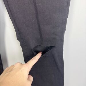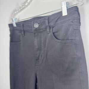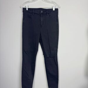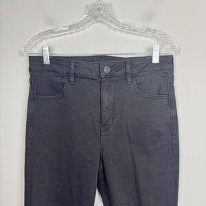 Nice black denim jeans by American Eagle Outfitters. Ne(x)t Level Stretch material. High rise. Zipper and button fly. One slit rip at the knee on one leg (factory distressing). Great condition!! Size 12 Short.