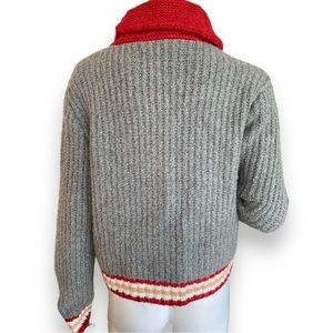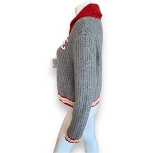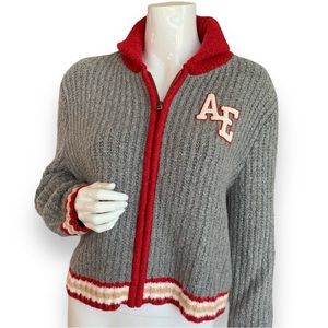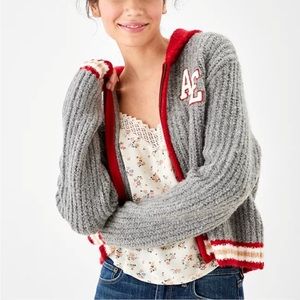 Whether it’s cold winter days, vibrant autumn colors, hot summer days, or gentle spring breezes, this cotton blend cropped varsity sweater from American Eagle Outfitters will accompany you with sass & style! Pair it with jeans for a stylish look. This sporty designed cardigan features the AE letter patch, front zip closure, & red/white striped trim at hemline & on cuffs. Women’s Size Medium. Armpit to armpit measures 23”. Sleeve seam is 18”. Side seam is 11”. Pre-owned. In good condition.