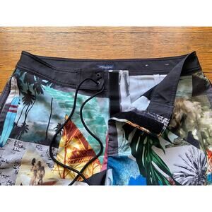 AMERICAN EAGLE Colorful Beach Themed Boardshorts size L. Featuring a velcro fly w/drawstring closure, slash mesh pockets, rear flap pocket, stretch and quick drying.