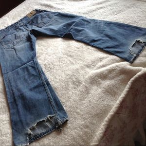 AMERICAN EAGLE FADED, DESTROYED JEANS, WORE ALOT AT THE BEACH, MOST WEAR SHOWS ON THE HEELS, COOL CUT, 32/30 PRICED ACCORDINGLY, SOLD AS IS