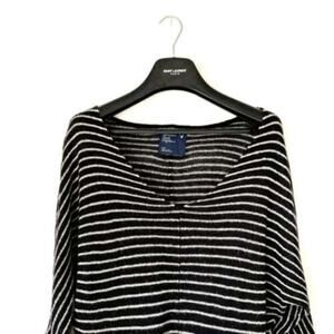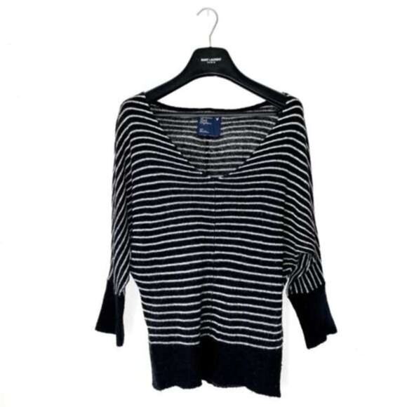 This American Eagle Outfitters AE black & white striped long sleeve, a draped wing Dolman Sleeve sweater is a V-neck, with a wide drape, and long sleeves. This is an acrylic, wool & mohair blend.