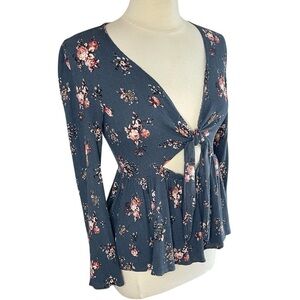AMERICAN EAGLE FLORAL TIE-FRONT CUTOUT TOP WITH LONG FLARE SLEEVES