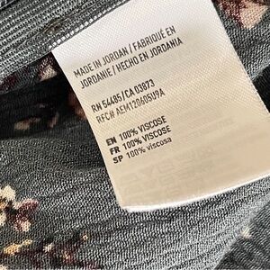 Slate gray (gray blue) with light pink allover print lightweight top featuring a tie front that creates a cutout opening just below it. This gives the top a fit & flare silhouette with the addition of an elastic band at the bottom portion of the front opening, ensuring a perfect fit.