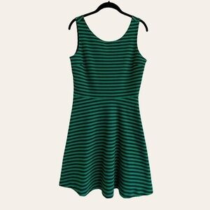 AMERICAN EAGLE, GREEN & BLUE STRIPE DRESS. COMFORTABLE, EASY CARE DRESS WITH CRISS CROSS BACK & FLARE SKIRT. HIDDEN SIDE ZIPPER & SHOWN BACK ZIPPER. SIZE 12.