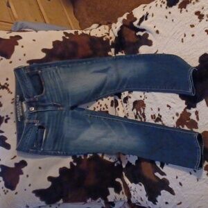 AMERICAN EAGLE JEANS, WOMENS SIZE 6 SHORT, SUPER STRETCH, PLEASE NOTE, THE PATCH IN THE BACK HAS A RIP, SEE IN PIC. MEASUREMENTS BELOW APPROX.