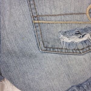 Shorts are in good pre-owned condition. Super soft, well worn denim. Front zipper fly with button closure. Lots of distressing. Side seam on one side is open. Multiple marks & spots. Please see photos for details.