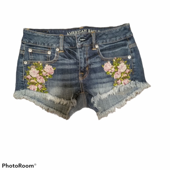 AMERICAN EAGLE Low Ride Raw Hem Embroidered Floral Denim Shorts