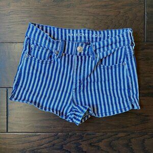 NE(X)T Level Stretch. Hi Rise Shortie style. Denim striped shorts from American Eagle. 5 pocket style with small slits at thigh. Size 0.