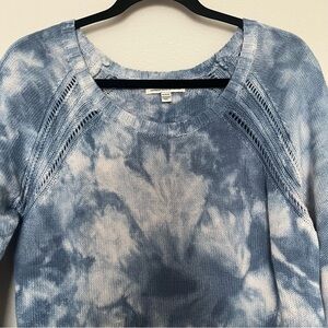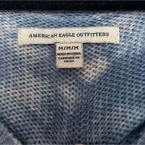 AMERICAN EAGLE OUTFITTERS- Blue and White Abstract knit Crewneck Sweater Size M. Has small hole design near neckline. Material is very nice, not too thick or thin. Excellent condition.