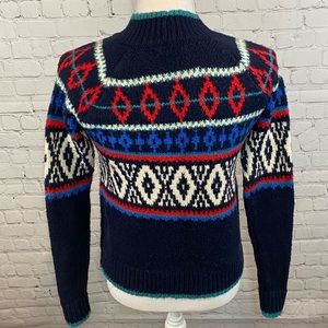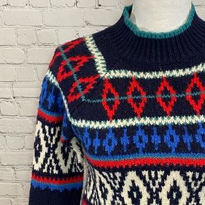 Gently used soft cotton blend sweater with high neck and colorful design. 53% cotton,35% acrylic, 11% polyester, 1% elastane. Measures 17" pit to pit and 21.5" shoulder to hem. (Ref L)