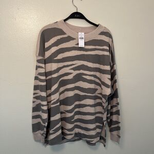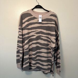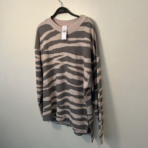 Super soft blended fabric. Dusty gray and dusty rose zebra striped pattern. Brand new with tags, only flaw is hole by where price tag is. It is the size of a pinhole. Sweatshirt measures 29 1/2 inches in length, and 23 inches from armpit to armpit.