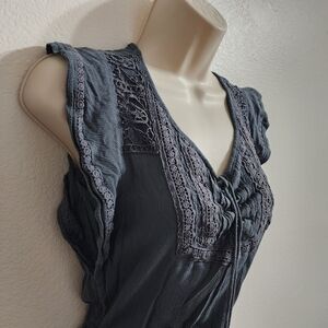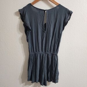 Blue short sleeve romper with flutter sleeves, lace-up ties and crochet details. Elastic waistband. Size XXS. EUC.