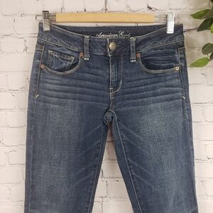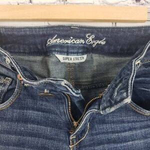 AMERICAN EAGLE Super Stretch Skinny Jeans Size 2. The pair of jeans have 3 front pockets, belt loops and a button and zipper closure, there are also 2 back pockets and a great faded design and amazing stretch. Excellent condition, no heal drag, holes or rips.