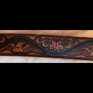 American Eagle Engraved Top Grain Cowhide Leather Belt. Beautiful and in excellent condition. Size 46 *NOTE In photo 3 it appears someone may have put 3 extra holes in belt or, perhaps it was by design (?)