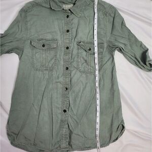 AEO button up loose fitting long sleeve utility shirt. Grayish green color that goes with so many things! Very faint spot shown in photos. Looks great tied up in the front. Lyocell.