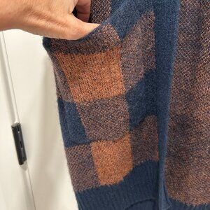 AMERICAN EAGLE rusty orange & dark blue/navy blue buffalo check open-front cardigan (no buttons) with two patch pockets; ribbed navy blue cuffs and ribbed at bottom hem. Extremely soft, slightly fuzzy material. NOTE: AE has this marked as XS, but based on how it fits me, I think it would be quite oversized/baggy for someone who is a true XS --the sweater would be more appropriate for someone who is a small (S) or medium (M). Very cute sweater in great pre-loved condition!