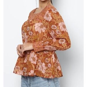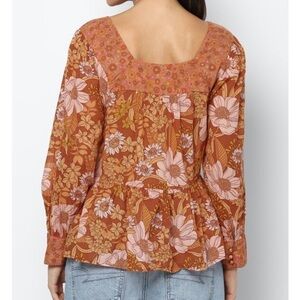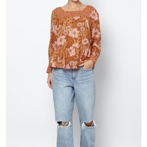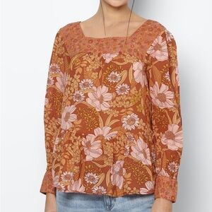 AMERICAN Eagle Orange Long Sleeve Square Neck Peasant Blouse Mixed Floral sz L
