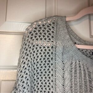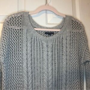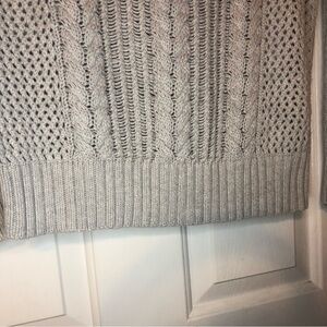 Light gray boxy sweater with a cable knit front with an open knit back and sleeves. Ribbed cuffs, hem, and neckline.