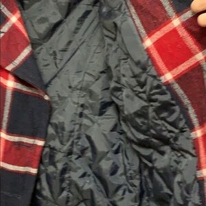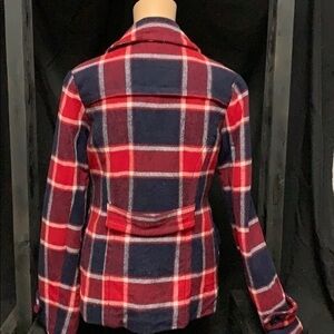 Size small. Red, white, and blue pea coat. Wool/rayon shell. Polyester liner and filling. Very good condition.