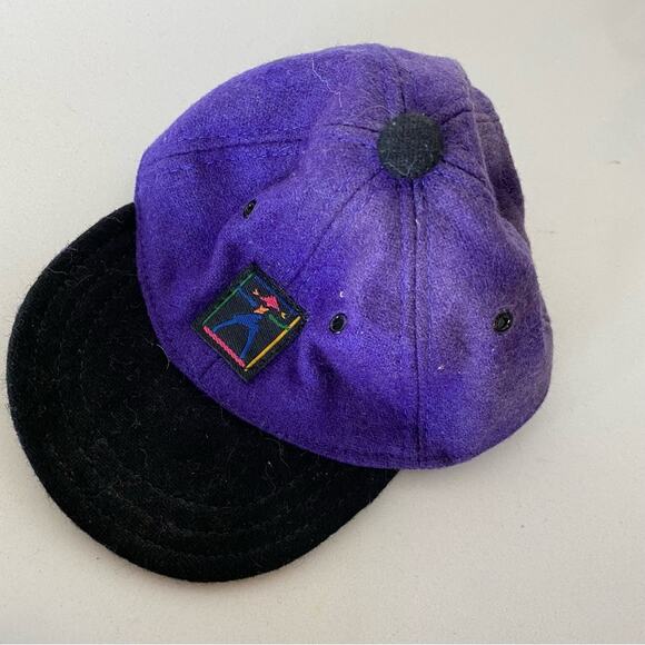 Purple and black wool baseball cap. Purple panels, black bill. Black eyelets around hat and black button at top. adjustable back band on black buckle. interfacing and black trim on interior. American Girl of Today logo on patch at front.