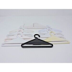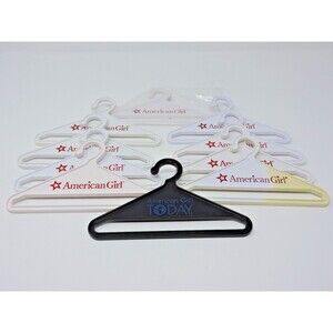 Set of ten American Girl Star Logo Doll Clothing hangers. One hanger is NEW sealed. One hanger is a preowned black American Girl TODAY. Six hangers are preowned white. Two of the hangers are preowned white but have some discoloration which does not affect the structural integrity of the hangers. Hangers are made of sturdy hard plastic and can accommodate American Girl or any other brand of 18 inch doll clothes.