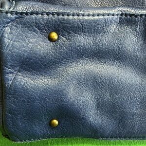 American leather company 💯 % soft leather, triple entry antique hardware for vintage touch excellent condition beautiful blue snap closure exterior back pocket interior middle large zip pocket one side zip pocket other two slip pockets, metal feet on bottom double leather strap very nice bag check all pics . Comment with any questions.