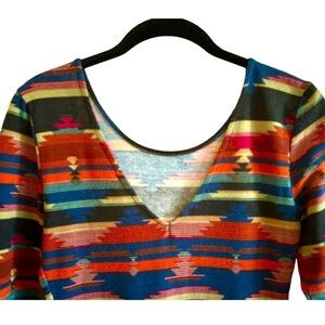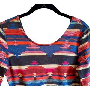 AMERICAN RAG, BODYCON DRESS. STRETCHY, SOUTHWESTERN STYLE PRINT. 3/4 SLEEVE, SCOOP NECK, V-NECK BACK. SIZE XS
