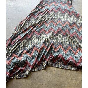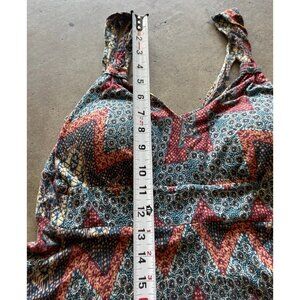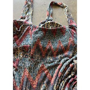 The American Rag Cie Summer Festival Dress in XS features a bohemian handkerchief hem design with wide straps, perfect for a summer festival. The dress has a patchwork bandana boutique pattern in red, a sleeveless sweetheart neckline, and a pullover closure. Made from jersey material, this long empire waist dress is machine washable and embodies a hippie, festival character. With its stylish accents and bohemian theme, this dress is a must-have for the summer season.
