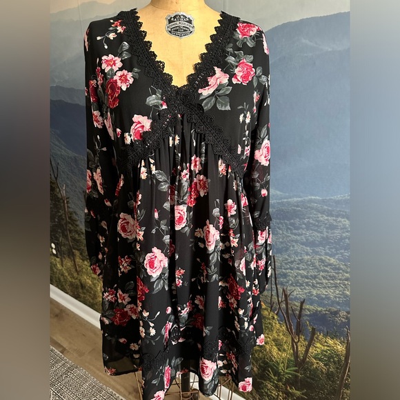 AMERICAN RAG dress, lightweight, black with pink flowers, long sleeves. Size M, excellent condition.