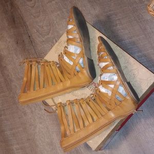 THIS IS A FAB PAIR OF SANDALS IN SIZE 5 BY AMERICAN RAG IN A BURNT TAN COLOR AND STYLE AMAYTAN. SUPER CUTE AND REMIND ME OF GLADIATOR STYLE SANDALS. THEY ARE ZIP UP SANDALS (ZIPPER ON BACK) WITH LACES GOING UP THE FRONT TO ADJUST THEM WIDTH WISE FOR ADDITIONAL COMFORT. THEY ARE IN GREAT CONDITION STILL GRANTED THEY HAVE BEEN WORN A HANDFUL OF TIMES. THEY DO HAVE SOME MINOR DISCOLORATION THROUGHOUT (AS PICTURED) BUT NOTHING SOME BOOT AND SHOE CREAM CAN'T FIX. THEY ARE IN THEIR ORIGINAL BOX AND READY TO BE STYLED.