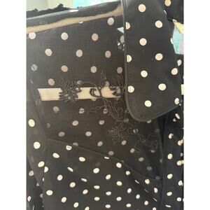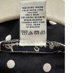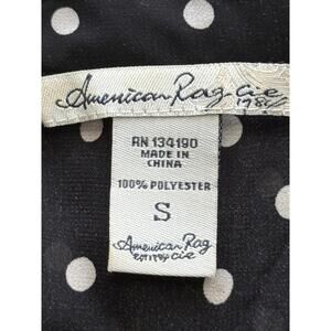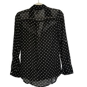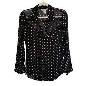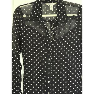 AMERICAN RAG Sz S Black & White Polka Dot Decorative Lace on Front Shoulders Button Up Sheer Long Sleeve Roll Tab One Owner Minimal Wear | GUC