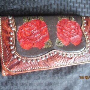 Southwest Indian foundation. Embossed hand tooled and hand painted on vegetable tanned dark chocolate brown leather. High quality leather with floral pattern. Studded accents. Trimmed with hand tooled caramel leather and small silver spots.
