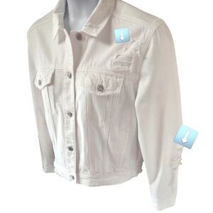 💥Your purchasing a new without tag/not used women's white cropped distressed, frayed, many holes, button down denim jacket no issues sat in daughter's closet. Has been heavily discounted for a quick sale!