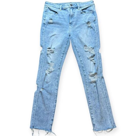 AMERICAN EAGLE Women's Light Blue Wash The Dream Jean Super Hi-Rise Distressed Denim Jegging Jeans Size 8