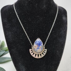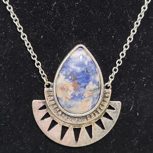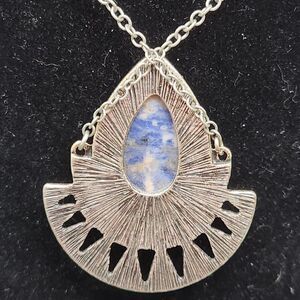 Blue stone natural pendant necklace in a silver tone color. It is a long pendant style necklace that measures approximately 30" with a 2" extender and finished off with a lobster clasp closure. Please see all photos for details and condition as this is the exact pair you will receive. Thank you so much for stopping in my closet. I am always open to reasonable offers. Have a fantastic day!