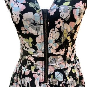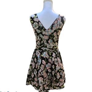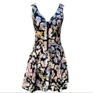 From American Rag, an adorable cotton floral dress with a zipper front closure. Sleeveless, v-neck front & back, fit & flare silhouette with exposed stitching horizontal pleating at the waist and 2-layer skirt.